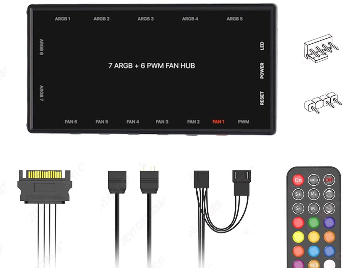 El Controlador ARGB Y PWM que presentaremos en esta ocasión proporciona 7 Puertos ARGB de 3 pines y 6 puertos PWM de 4 pines.